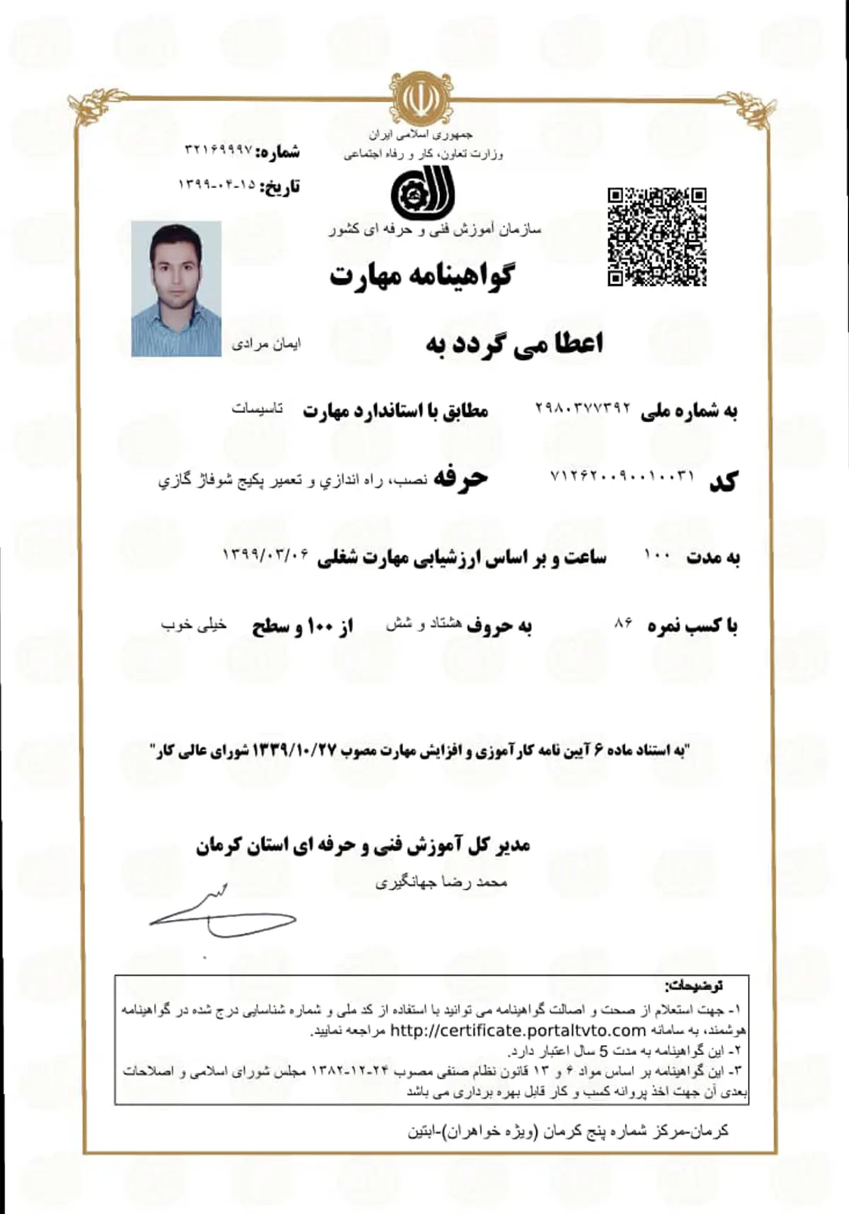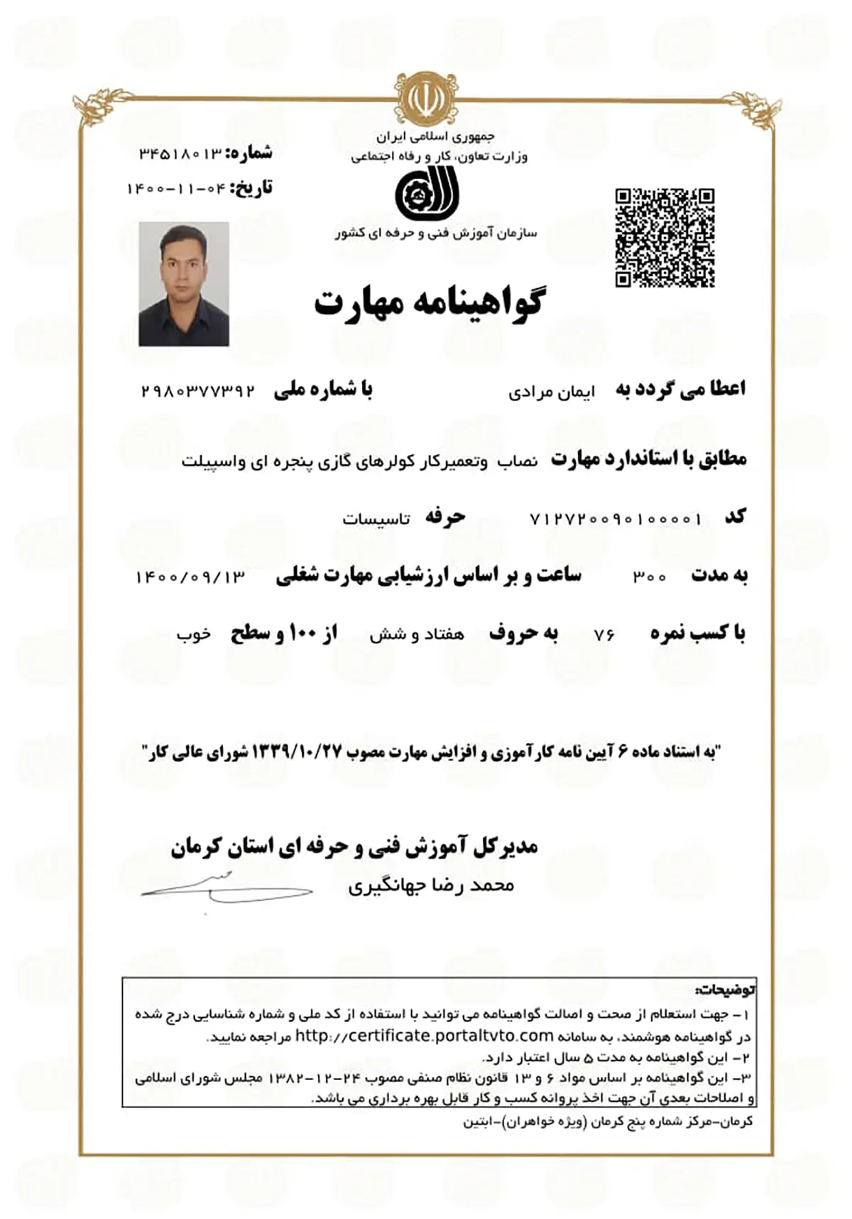 مدرک توسط سازمان فنی و حرفهای کشور صادر شده و شامل آموزشهای استاندارد در زمینه نصاب و تعمیرکار کولر گازی پنجره ای و اسپیلت، اصول عیبیابی، رفع خرابیهای رایج و انجام تعمیرات ایمن و اصولی است.