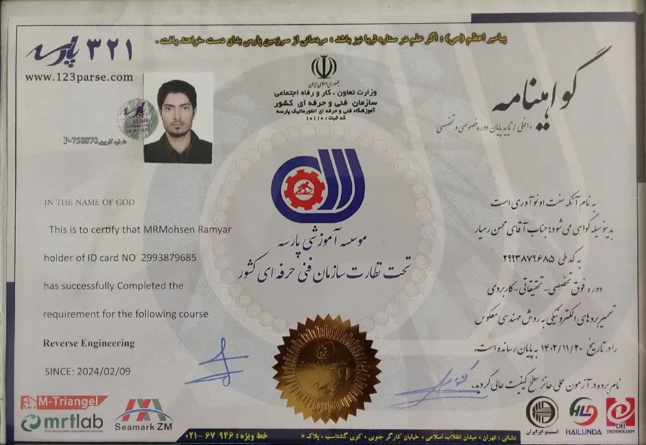دارای گواهینامه آموزش تخصصی تعمیر بردهای الکترونیکی از آموزشگاه معتبر پارسه 123. این دوره شامل آموزش ساختار بردهای الکترونیکی، عیبیابی و اصول تعمیر بردهای مورد استفاده در ماشینهای لباسشویی و ظرفشویی و سایر لوازم خانگی بوده است.